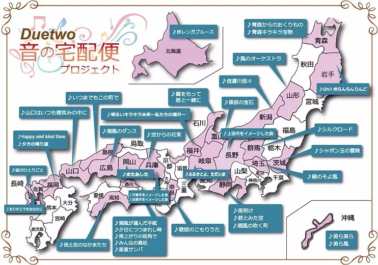 デュエットゥ かなえ&ゆかりのライフワーク「音の宅配便」 コンサート活動を続けて行く中で何かデュエットゥにしかできないことはないか・・・ あるテレビ番組に出演したことがきっかけで作曲ををして演奏すると喜んでくれる・・・ そして これが「音の宅配便」の始まりです。 その土地の皆さんにプレゼントされた曲は ~日本全国に新しい曲をお届けしています~ 音の宅配便では、まずその土地に2人が出向いて作曲のイメージを膨らませていきます。 その後、作曲活動に入り1つの曲へと完成させていくのです。 完成した曲は、子供たちに聴いてもらって その土地の子供たちも参加しながら 今までの作曲リスト(2017年版) ![]()
