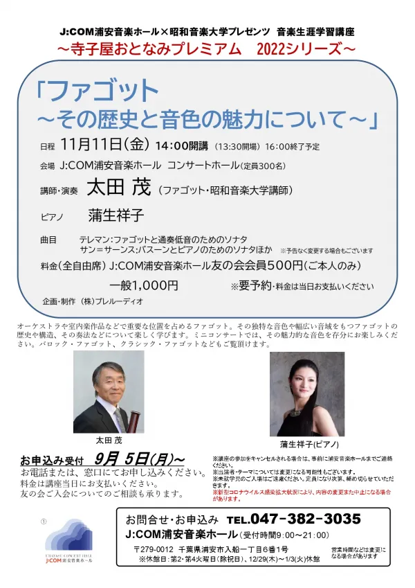 | 会場 | J:COM浦安音楽ホール(定員300名) (JR京葉線・武蔵野線「新浦安」駅南口徒歩1分) |