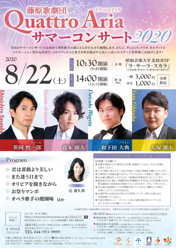 | 出演 | 藤原歌劇団 Quattro Aria 笹岡慎一郎(テノール) 有本康人(テノール) 和下田大典(バリトン) 大塚雄太(バリトン) 辻喜久栄(ピアノ) |