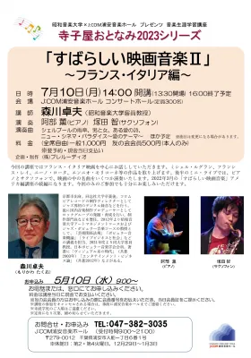 2022年3月の「すばらしい映画音楽」講座の続編。今回はフランス・イタリア映画を中心にお話ししていただきます。ミシェル・ルグラン、フランシス・レイ、ニーノ・ロータ、エンニオ・モリコーネ等の作品を取り上げます。後半のミニコンサートでは、ピアノとヴァイオリンで、映画の中の名曲をいくつか演奏いたします。