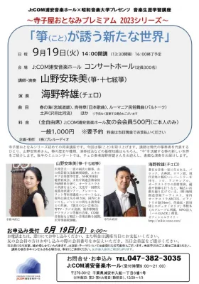 寺子屋シリーズ初めての邦楽講座です。今回は箏(こと)を取り上げます。講師は現代の箏奏者を代表するひとり、山野安珠美さん。箏の歴史や種類、演奏技法などの基礎知識はもちろん、“今”を活躍する箏の新しい世界をご紹介します。後半のコンサートでは、チェロ奏者海野幹雄さんをお迎えし、素敵な演奏をお届けします。